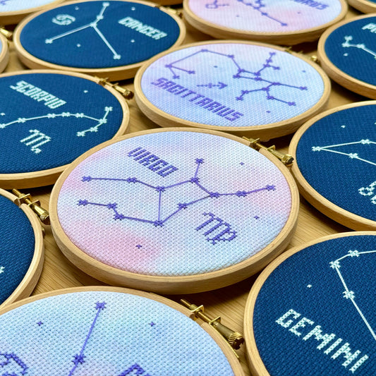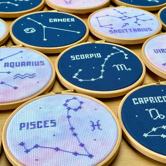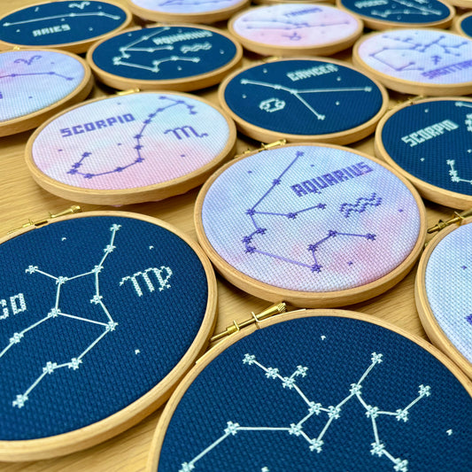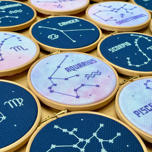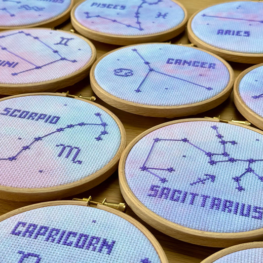 Stitch your Zodiac Constellation in the peaceful night sky or on a stunning galaxy effect.